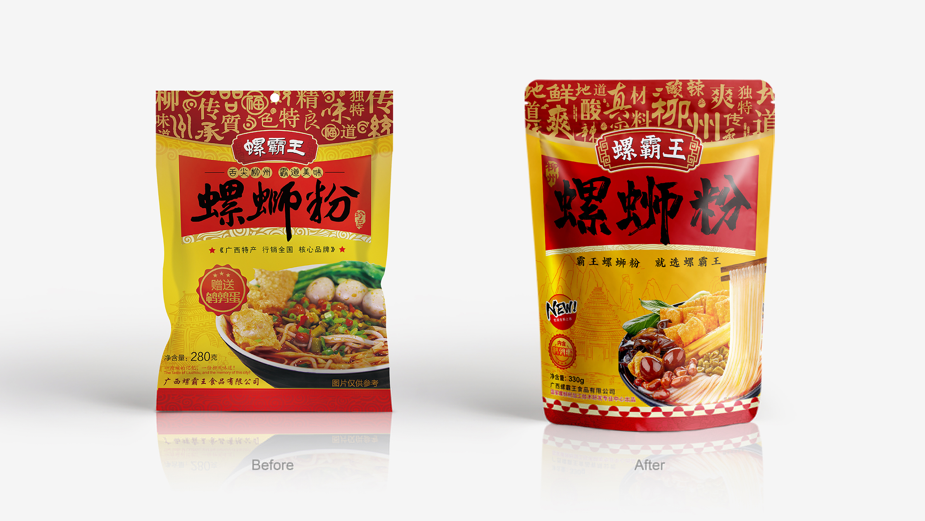從“柳州地域”與“中國(guó)第一”的角度審視,我們認(rèn)為,紅黃色之于螺霸王是非常有價(jià)值的,它不止于傳承品牌識(shí)別功能,更多的是柳州龍城“黃”與中國(guó)霸王“紅”的霸氣印象加持。